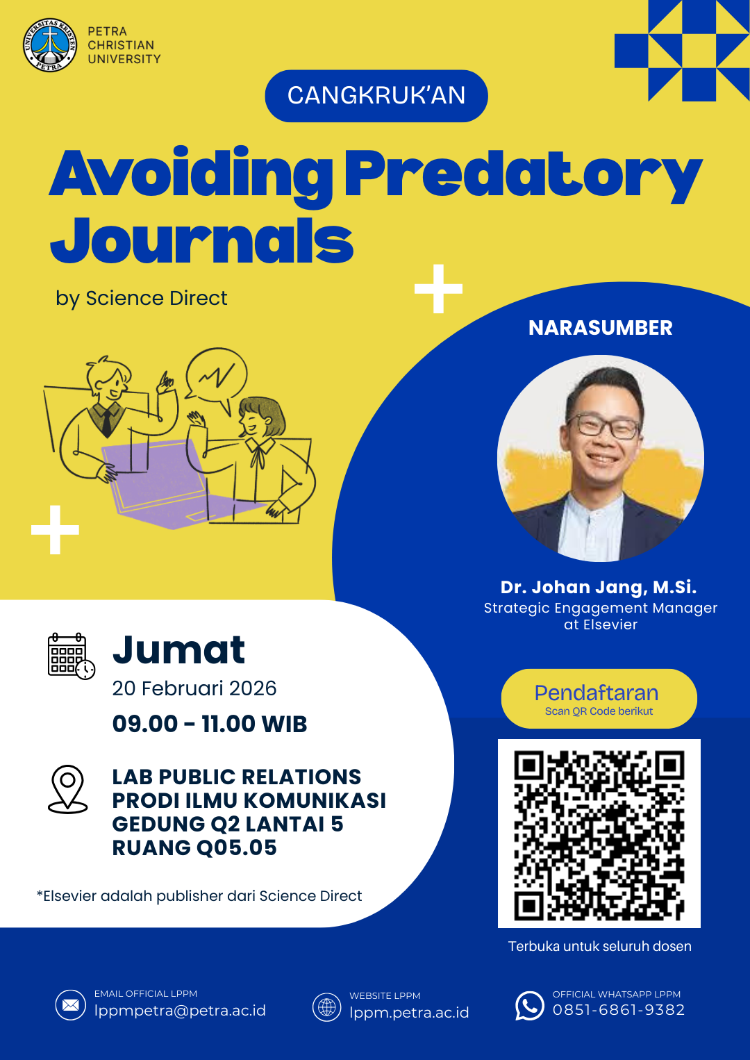 LPPM Universitas Kristen Petra Surabaya pada Jumat, 120 Februari 2026 bertempat di Lab Public Relations Progdi Ilmu Komunikasi UK Petra. mengadakan kegiatan Cangkrukan Ilmiah dengan mengangkat tema Avoiding Predatory Journals by Science Direct. Dengan narasumber Dr. Johan Jang, M.Si.