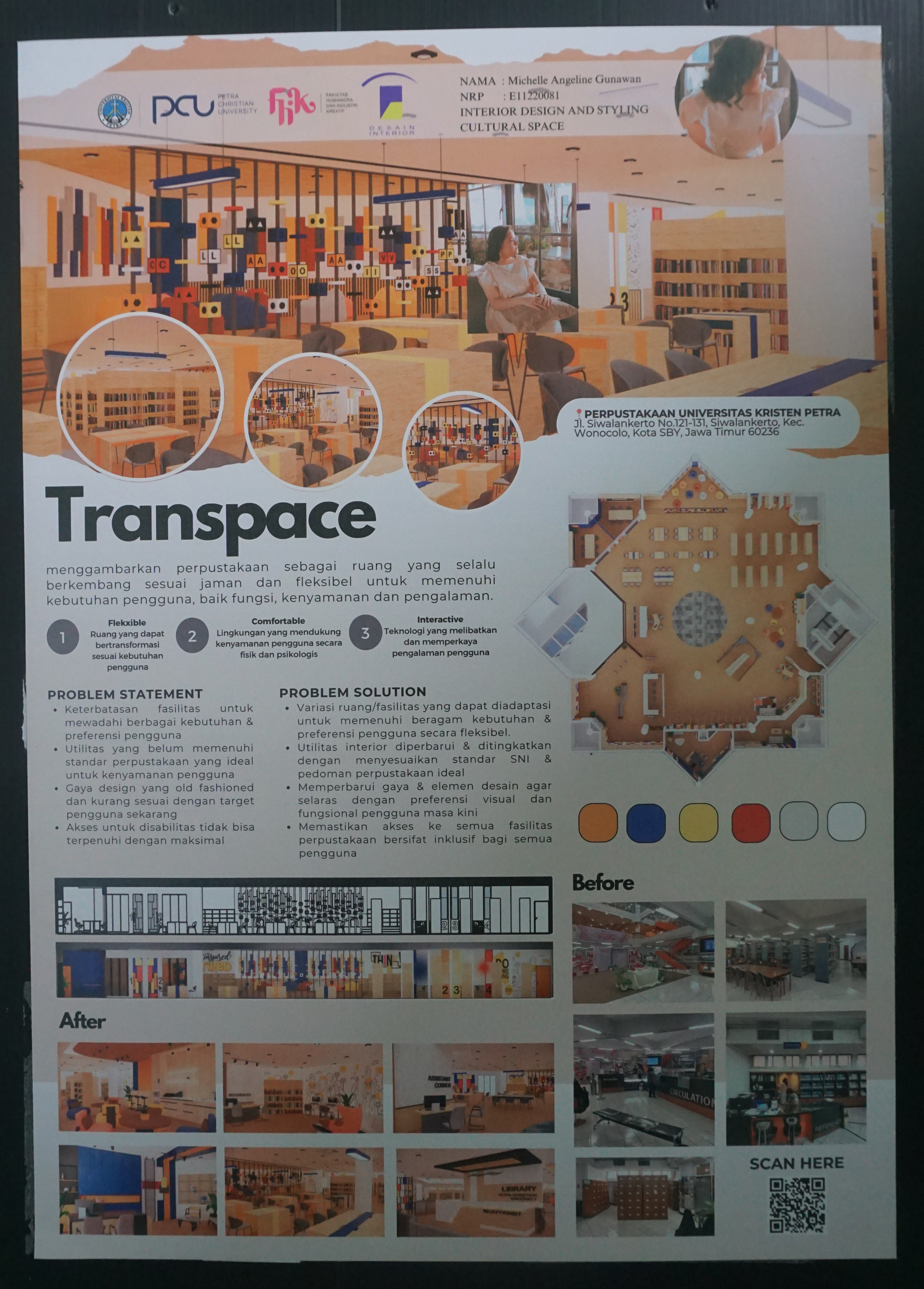 Dalam rangka menyemarakkan 27 tahun Prodi Desain Interior diselenggarakan seminar Insight bersama alumni dan pengguna lulusan, serta rangkaian acara IDE+ (Interior Design Exhibition and Workshop) 18-20 Juni 2025 yang menyajikan berbagai karya mata kuliah Personal Space, Presentasi Visual, Interior Design for Workspace, Furniture Design for Workspace, Interior Design for Cultural Space, Interior Product Design For Cultural Space, Craft and Furnishing, dan LEAP Final Project. Dalam pameran IDE+ tahun ini disajikan pula hasil karya kolaborasi project based learning Prodi Desain Interior PCU - UCSI dan UiTM. Salah satu materi pameran ini ialah Transpace Petra Christian University: interior design and styling cultural space. Karya Michelle Angeline Gunawan (E11220081)