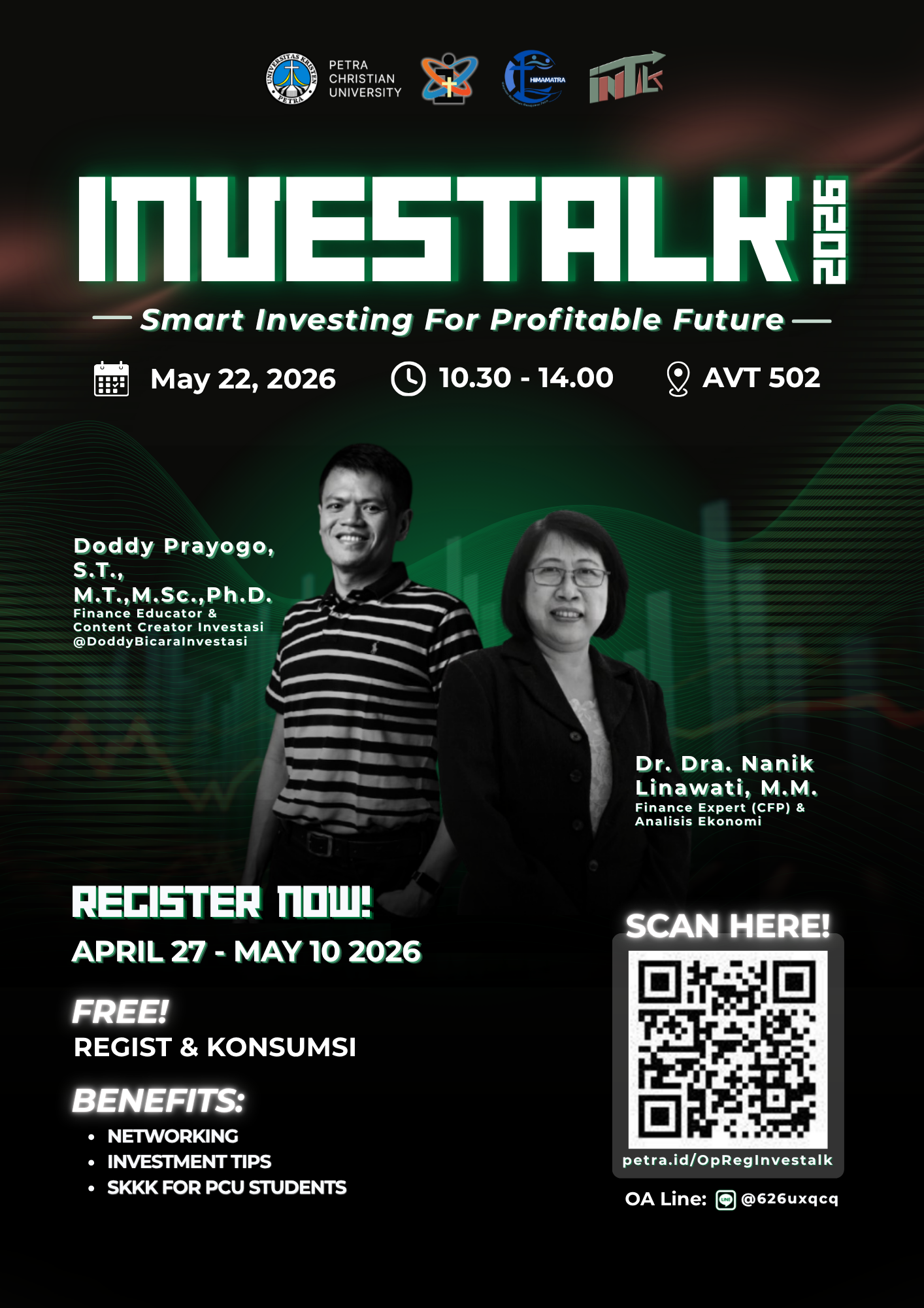 InvesTalk 2026 merupakan seminar edukatif yang diselenggarakan oleh mahasiswa Universitas Kristen Petra dengan tema “Smart Investing for Profitable Future”. Kegiatan ini bertujuan untuk meningkatkan literasi finansial mahasiswa, khususnya dalam memahami konsep dasar investasi, manajemen risiko, serta strategi pengelolaan keuangan yang efektif dan berkelanjutan.